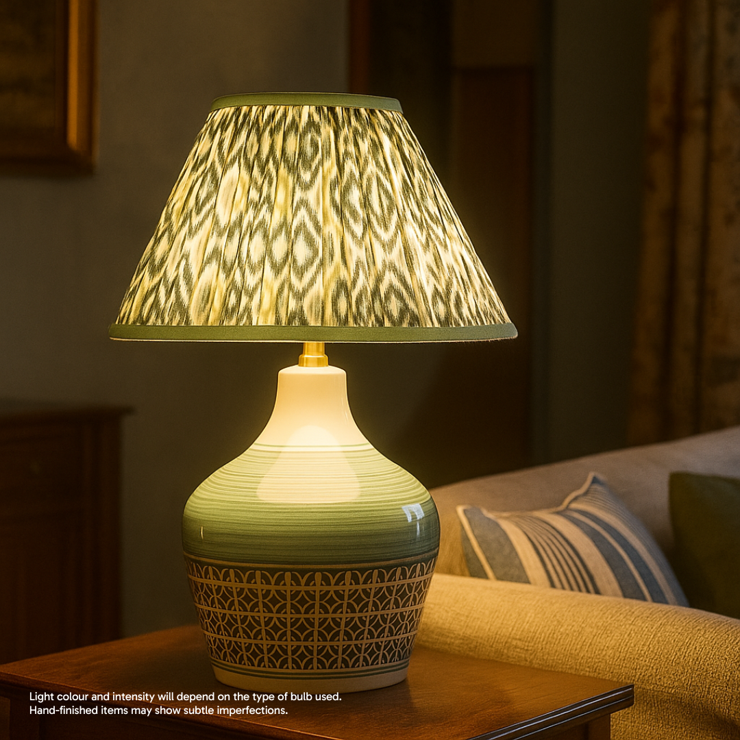 Earthy, cool, and totally eye-catching — the Green & White Ikat lampshade brings boldness with no nonsense. Diamond motifs in soft green and white create a rhythm across the gathered cotton — playful, earthy, and full of character. The shape flares gently from top to bottom for that timeless empire look.