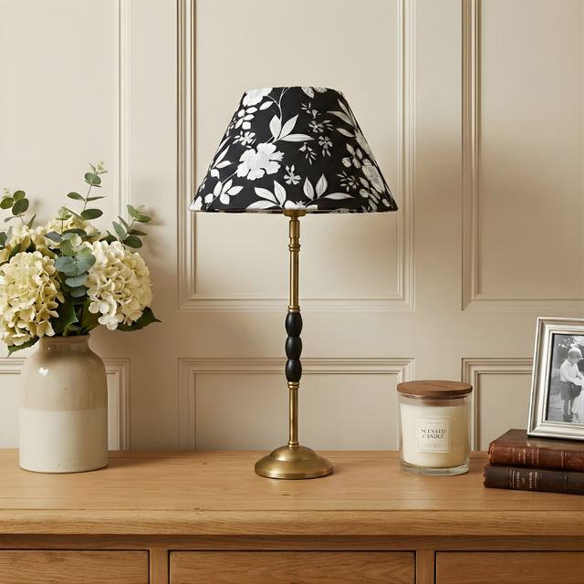 - Paired with a rolled empire lampshade in Midnight Blossom print.