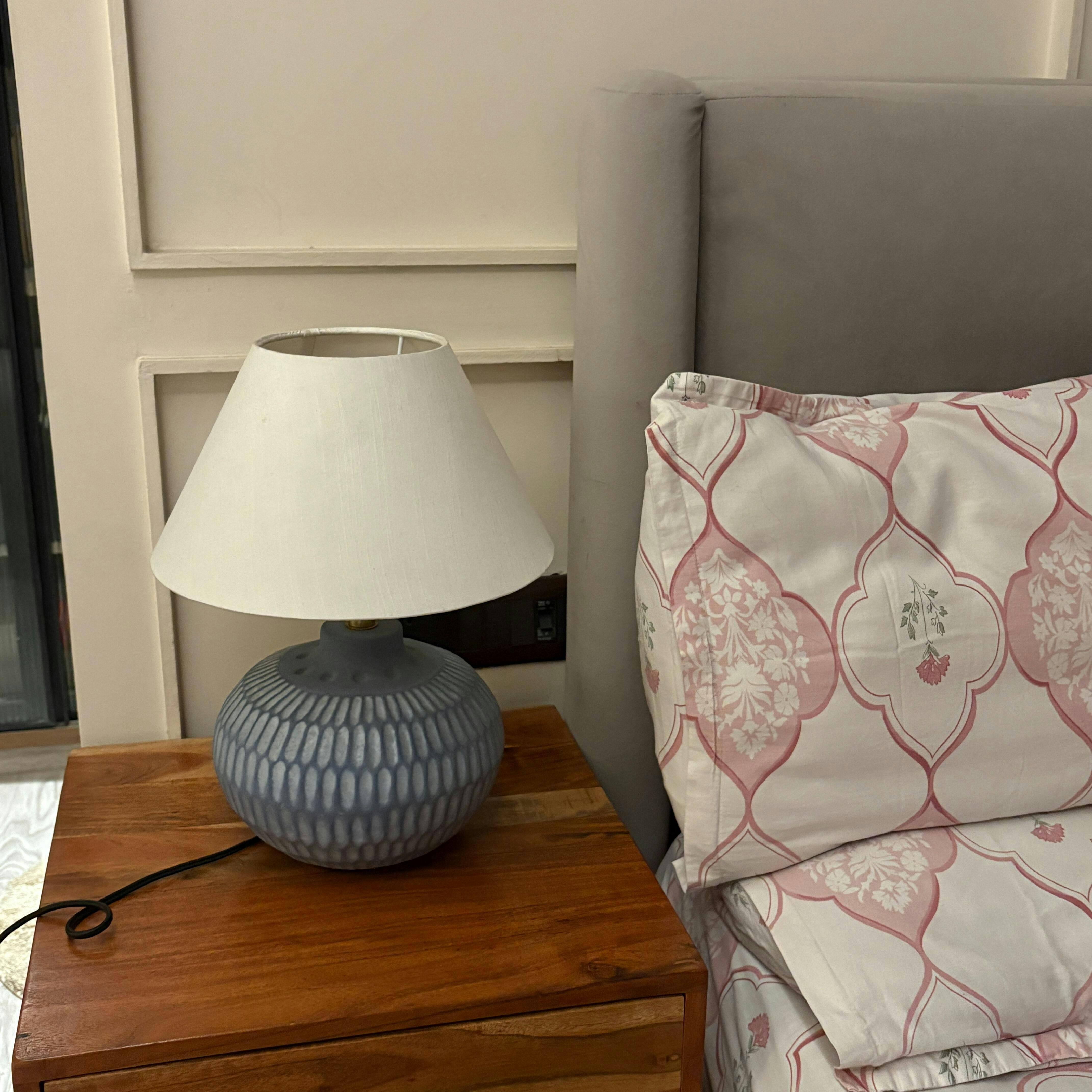 Discover the captivating York ceramic table lamp in matte blue, a true blend of modern and rustic charm. Its stylish round base and honeycomb-like design is a sight to behold. The natural matte finish adds a distinctive earthy charm. This lamp base makes quite a statement, casting a cosy glow on a sideboard, bedside table, or any cherished corner. Make it look perfect with an off-white or soft gray empire lampshade, between 30 and 35 cm, for a truly inspiring look.