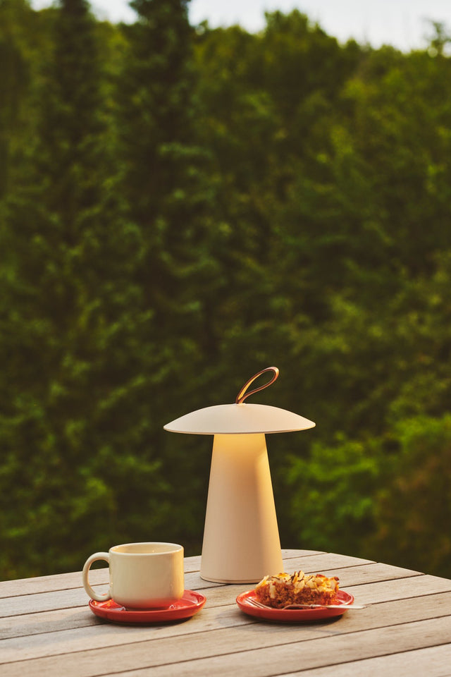 Bring warmth and style to any space with the Ara To-Go 2. This portable table lamp is designed for cozy summer nights, featuring a charming cone shape, soft leather details, and a built-in dimmer. Enjoy up to 80 hours of wireless illumination—anytime, anywhere.