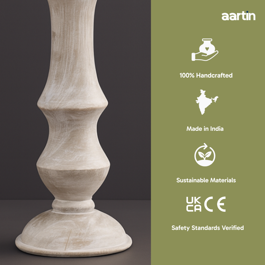 Want a lamp that's versatile - something that fits right into everyday homes? Welcome the wooden Eliza table lamp in a rustic whitewash finish. Its sleek curves and modern profile adds freshness and a stylish vibe to side tables or work desks. Pair it with a block printed cotton shade to add zing or a solid linen shade in light tones to enhance the soothing aura. A lampshade size between 30 to 35 cm will complement it well.